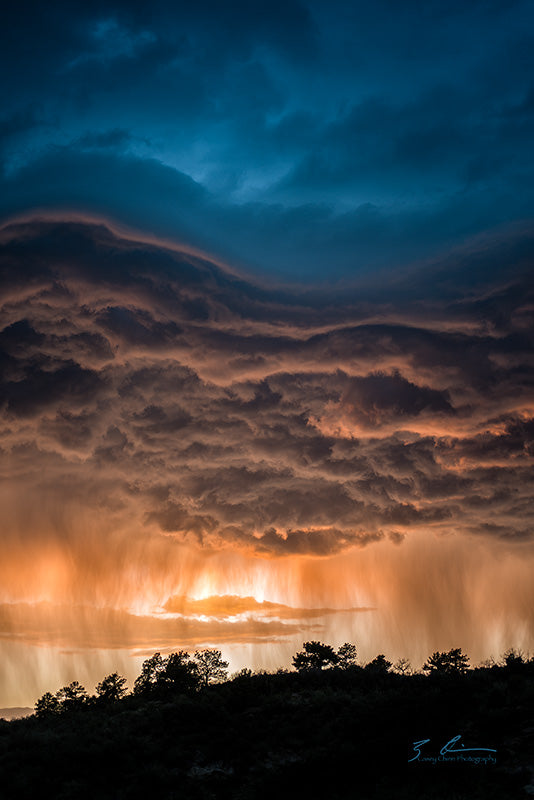 I was at my home one summer evening when I saw thunderstorms rolling in over the mountains as the sun was setting behind them. I quickly got over to nearby Palmer Park, a natural area near my house, and took a series of photos. This one was my favorite. I love the shape of the clouds, and the way the deep blue shows above the sunlit bottom. I have never seen clouds like it before or since.