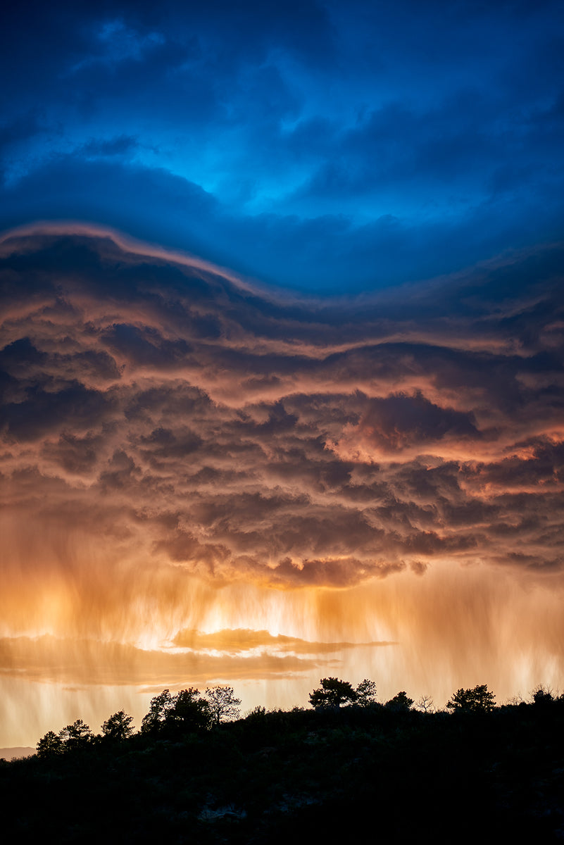 I was at my home one summer evening when I saw thunderstorms rolling in over the mountains as the sun was setting behind them. I quickly got over to nearby Palmer Park, a natural area near my house, and took a series of photos. This one was my favorite. I love the shape of the clouds, and the way the deep blue shows above the sunlit bottom. I have never seen clouds like it before or since.