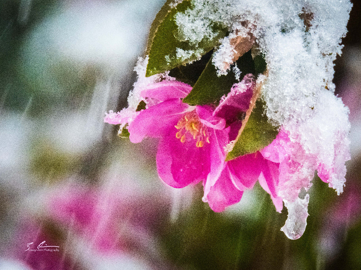 A Crabapple blossom on a snowy spring day. Holding the promise of warmer days ahead.