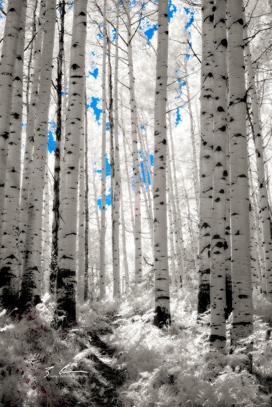 I took this image on a beautiful fall day of an Aspen forest in Colorado. It was done with a camera capable of capturing the infrared spectrum along with visible light, allowing the viewer to see what cannot be seen by the naked eye. The partial conversion to black and white, along with the blue sky, adds to the mystery.
